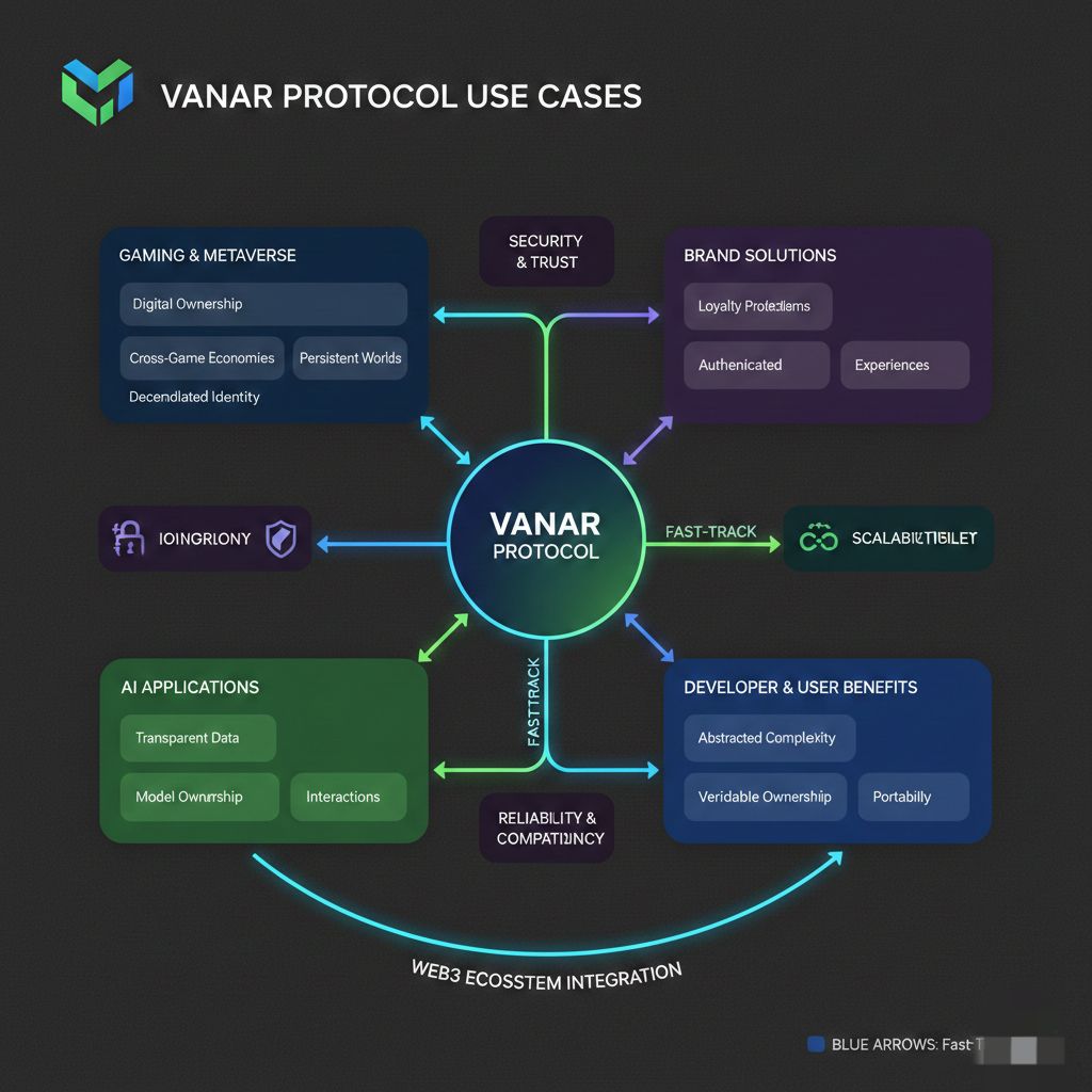 Vanar’s use cases span multiple industries because its infrastructure is not tied to a single application type. In gaming, it enables true digital ownership of in game assets and cross game economies without sacrificing performance. In metaverse environments, it supports persistent virtual worlds where identities and assets exist independently of any single platform. Brand solutions can use Vanar to manage digital collectibles, loyalty programs, and authenticated digital experiences. AI related applications can rely on the network for transparent data usage, model ownership tracking, or automated on-chain interactions between services.