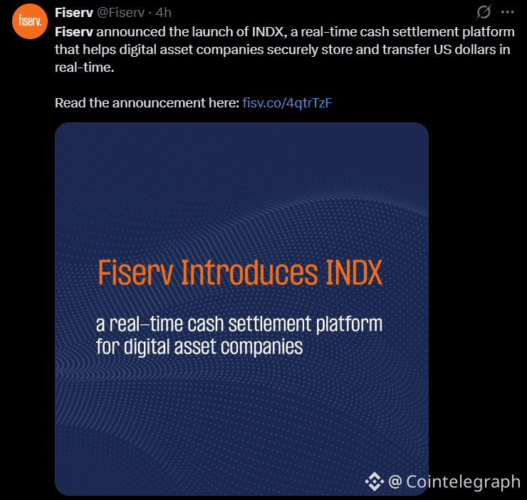 On Thursday, Fiserv announced the debut of INDX, a real-time cash settlement system that operates 24 hours a day, 365 days a year. The platform allows digital asset companies to move US dollars instantly using a single custodial account, potentially improving how exchanges, trading desks and other crypto businesses manage fiat balances.