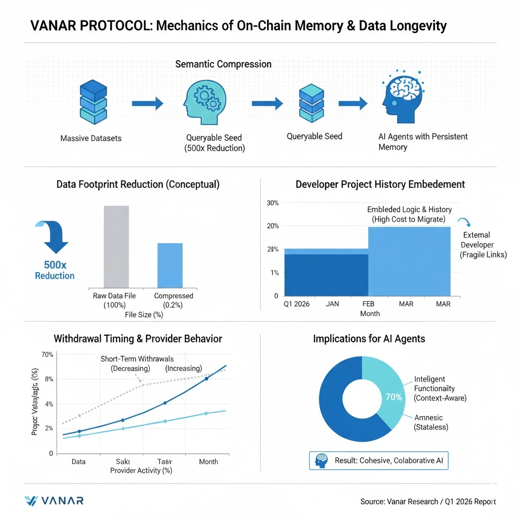 In this environment, the way we handle data density determines the longevity of a project. Instead of relying on fragile external links, tools like #Vanar use semantic compression to turn massive datasets into queryable seeds. By reducing the footprint of a file sometimes by up to 500 times while keeping its meaning intact, the chain ensures that AI agents can function without "amnesia." This mechanism directly affects withdrawal timing and provider behavior; when a developer’s project history and logic are deeply embedded in the state of the chain, the cost of moving to a different ecosystem becomes significantly higher.