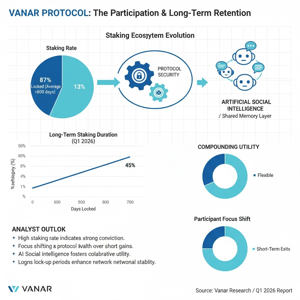Practical implications for contributors are becoming clearer as the staking ecosystem matures. Recent reports show a staking rate near 87%, with a significant portion of participants locking their positions for over 600 days. This indicates a preference for protocol security and governance over short-term exits. For the person contributing to the network, the focus has moved to how these AI agents interact with each other a concept often called "Artificial Social Intelligence." It allows different agents to plan and collaborate using the same shared memory layer, creating a compounding effect of utility.