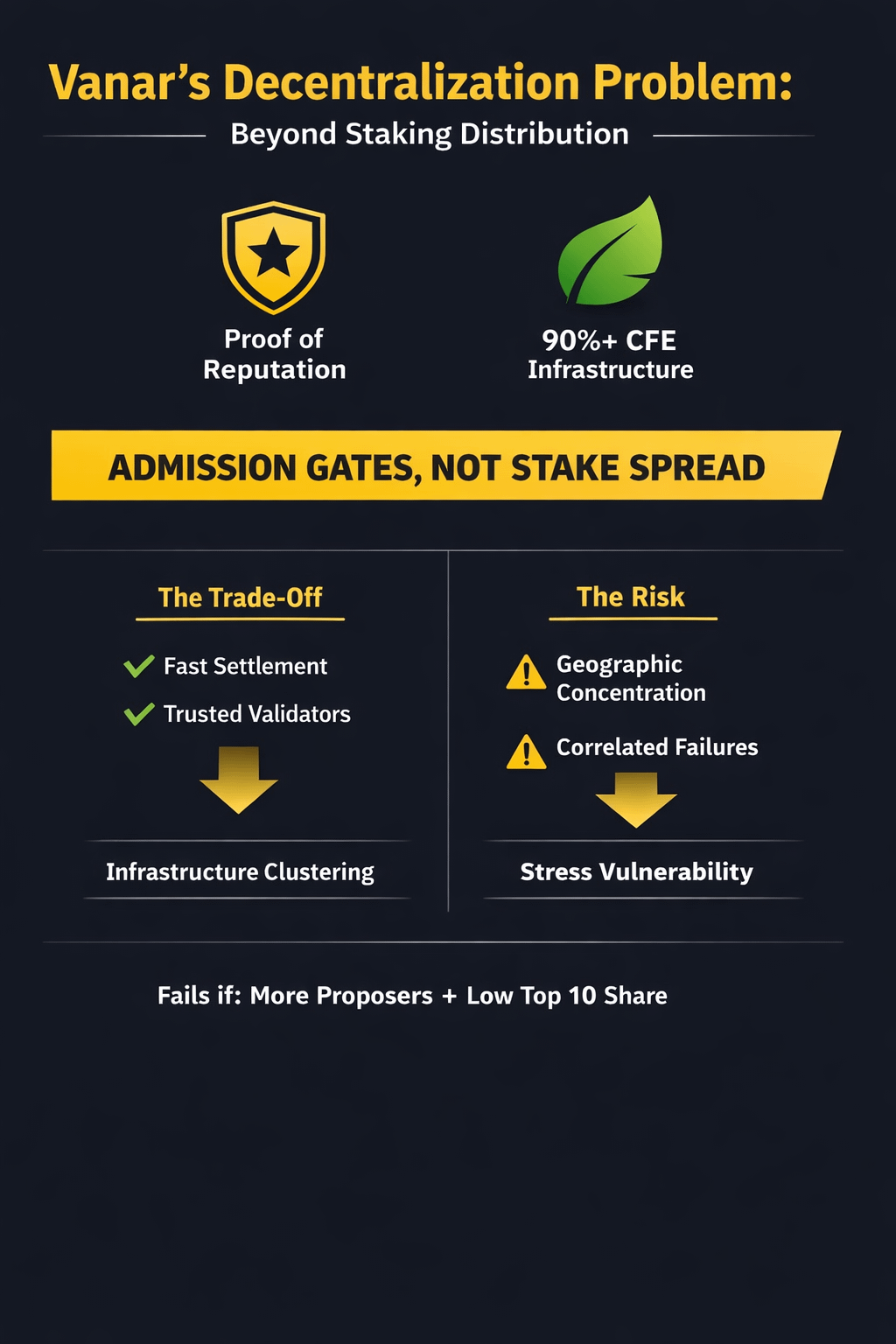 To judge Vanar’s decentralization in practice, I prioritize proposer dispersion over staking narratives because it reflects the admission gate in motion, and I use it as a practical read on whether the network is actually reducing correlated infrastructure risk. This thesis fails if the number of distinct block proposers keeps rising over time while the top-10 proposer share stays flat or declines.