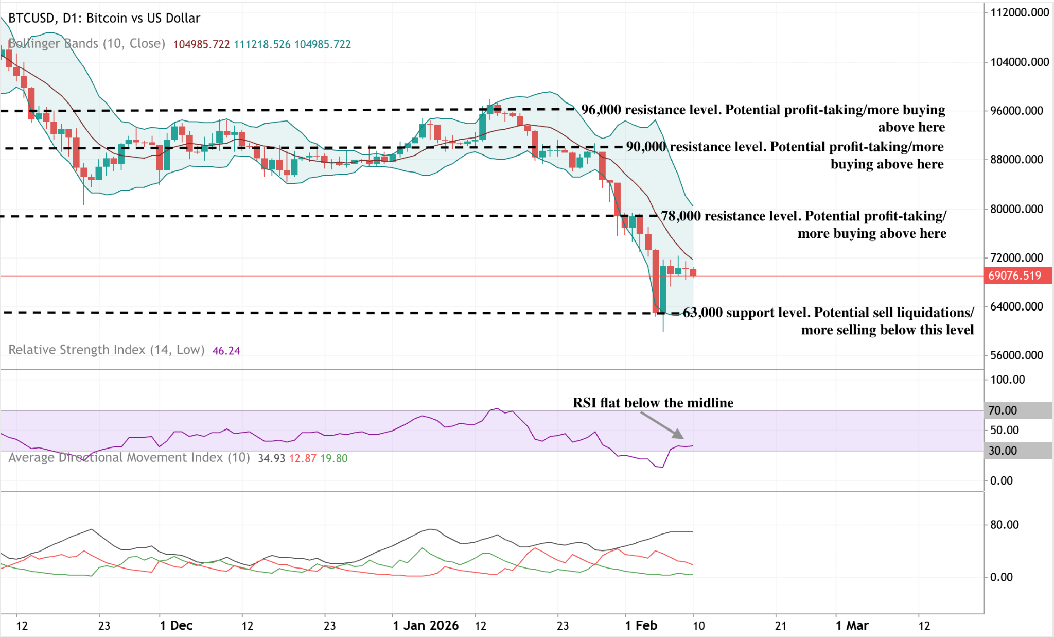 Mid-Jan 2026, BTC rallied to $89K with a bullish MACD cross (Jan 20: MACD up over signal, histogram expanding). But on Feb 10, a bearish cross happened at $82K—MACD dipped below signal amid shrinking histogram. This foreshadowed the drop to $78K. Smart traders shorted or exited longs here, avoiding a 5% loss.