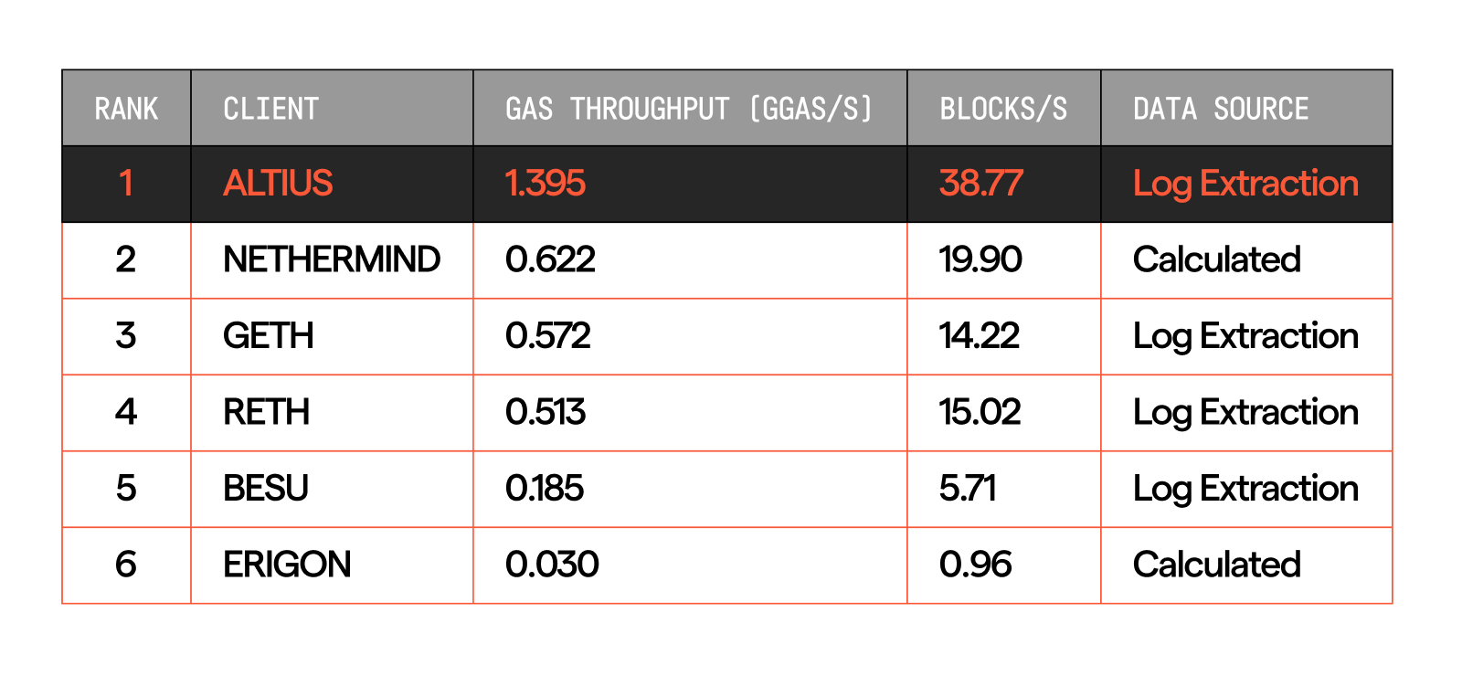 Altius thể hiện thông lượng gas vượt trội, vượt qua tất cả các client production lớn với khoảng cách đáng kể.
