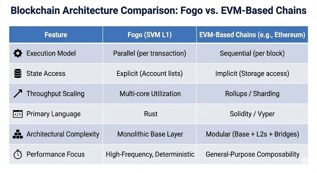 FeatureSVM (Fogo)EVM-Based ChainsExecution ModelParallelSequential (per block)State AccessExplicit account listsImplicit storage accessThroughput ScalingMulti-core utilizationRollups / shardingLanguageRust (primary)Solidity / Vyper