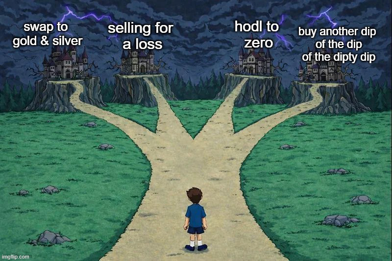 社区气氛看着热闹,其实全是幻想。很多人从高点追进去,现在被套在树上,下不来。看看这图,很多路可选,但hodl下去很可能就是零。
