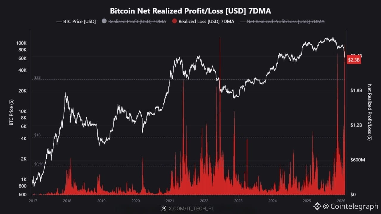 Bitcoin’s (BTC) seven-day average realized net losses hit $2.3 billion, analyst IT Tech said in a note on CryptoQuant on Thursday, which it called “one of the largest capitulation events in BTC history, rivaling the 2021 crash, 2022 Luna/FTX collapse, and mid-2024 correction.”