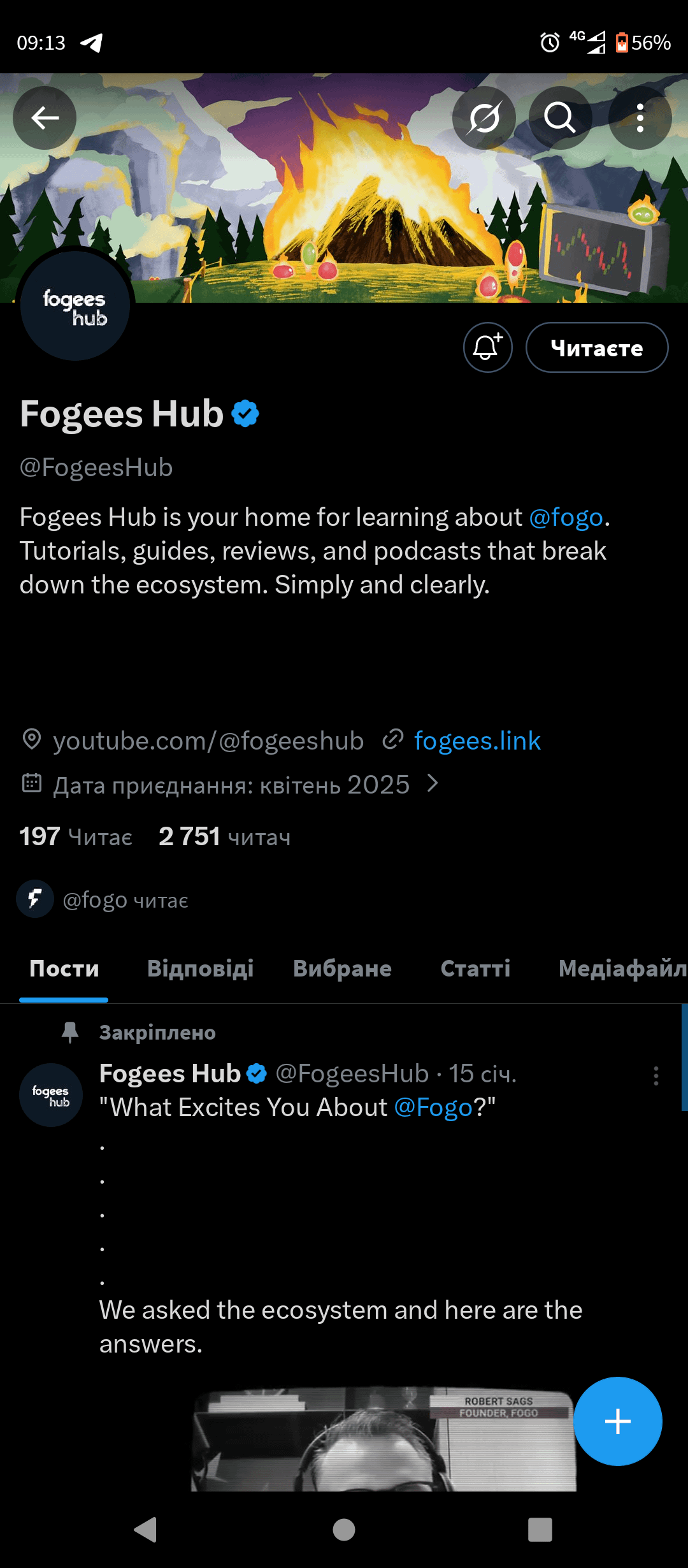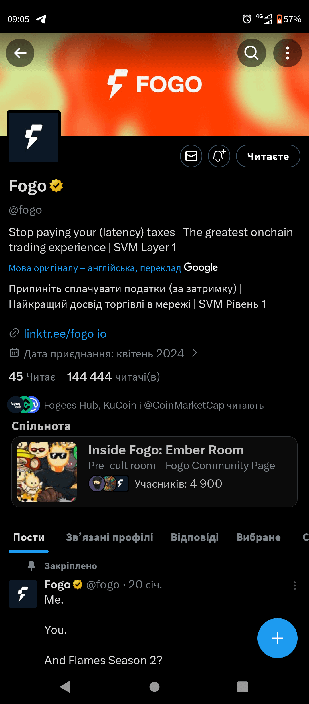 Сторінка @Fogo Official оформлена гарно, мені подобається. Ми на ній бачимо гарний логотип, посиланням на офіційний сайт, майже 150 тисяч читачів😱 та девіз (хотів його написати сюди, але він не копіюється). Трішки нижче ще є сторінка спільноти, вона на мене підписалася відразу після того як я підписався на їх основну сторінку. А ще я знайшов її сторінку з навчанням.