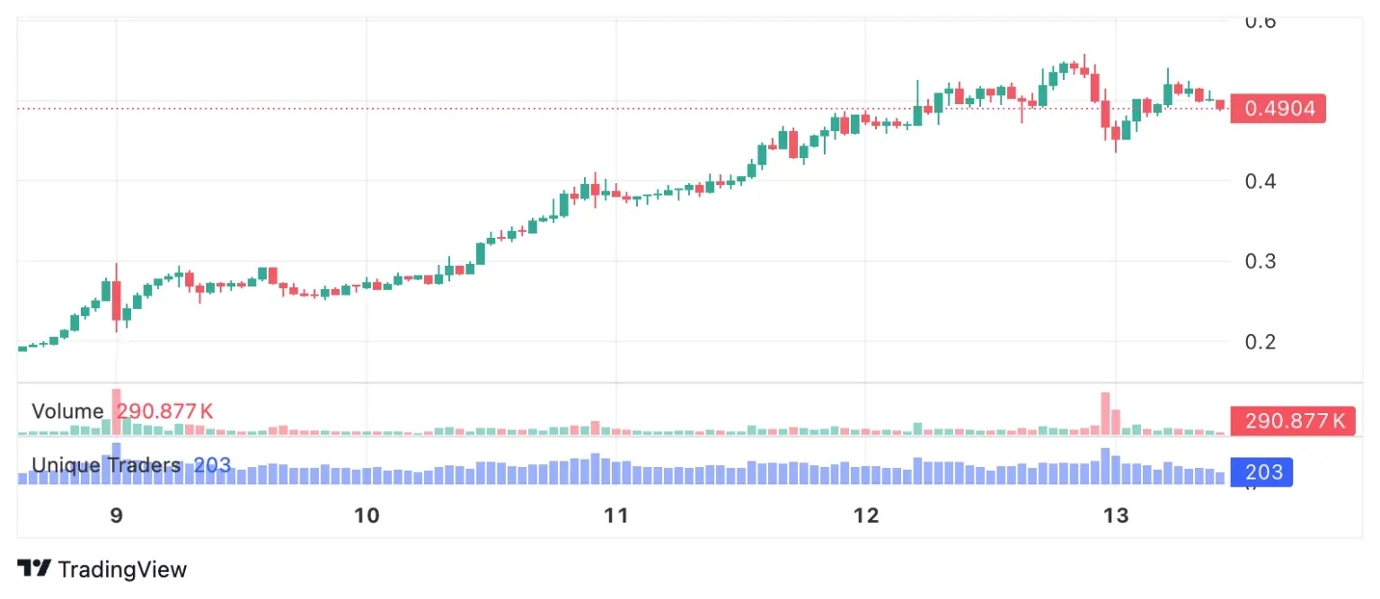 PIPPIN is trading around $0.4897, recording an increase of approximately 175.18% over the past week. Its market capitalization stands at around $489.71 million, with a 24-hour trading volume of $76.49 million.