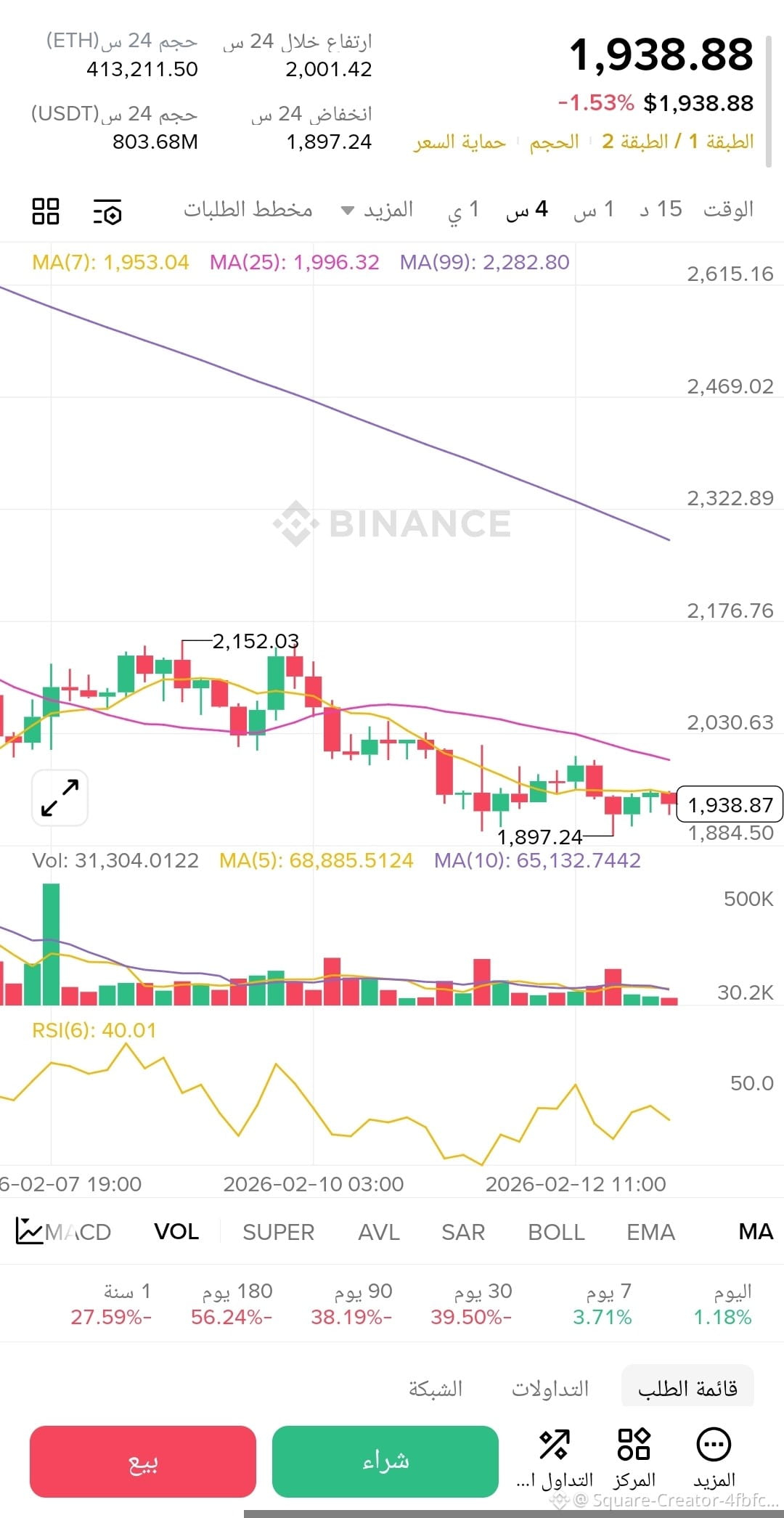 الإيثريوم يعاني من ضغط بيع قوي منذ بداية الشهر، حيث انخفض من فوق 2100$ إلى مناطق قريبة من 1900$، مع حجم تداول يومي يتجاوز 20-25 مليار دولار. لكن هل هذا تصحيح طبيعي أم بداية bear market أعمق؟ دعونا ننظر إلى المؤشرات الرئيسية: