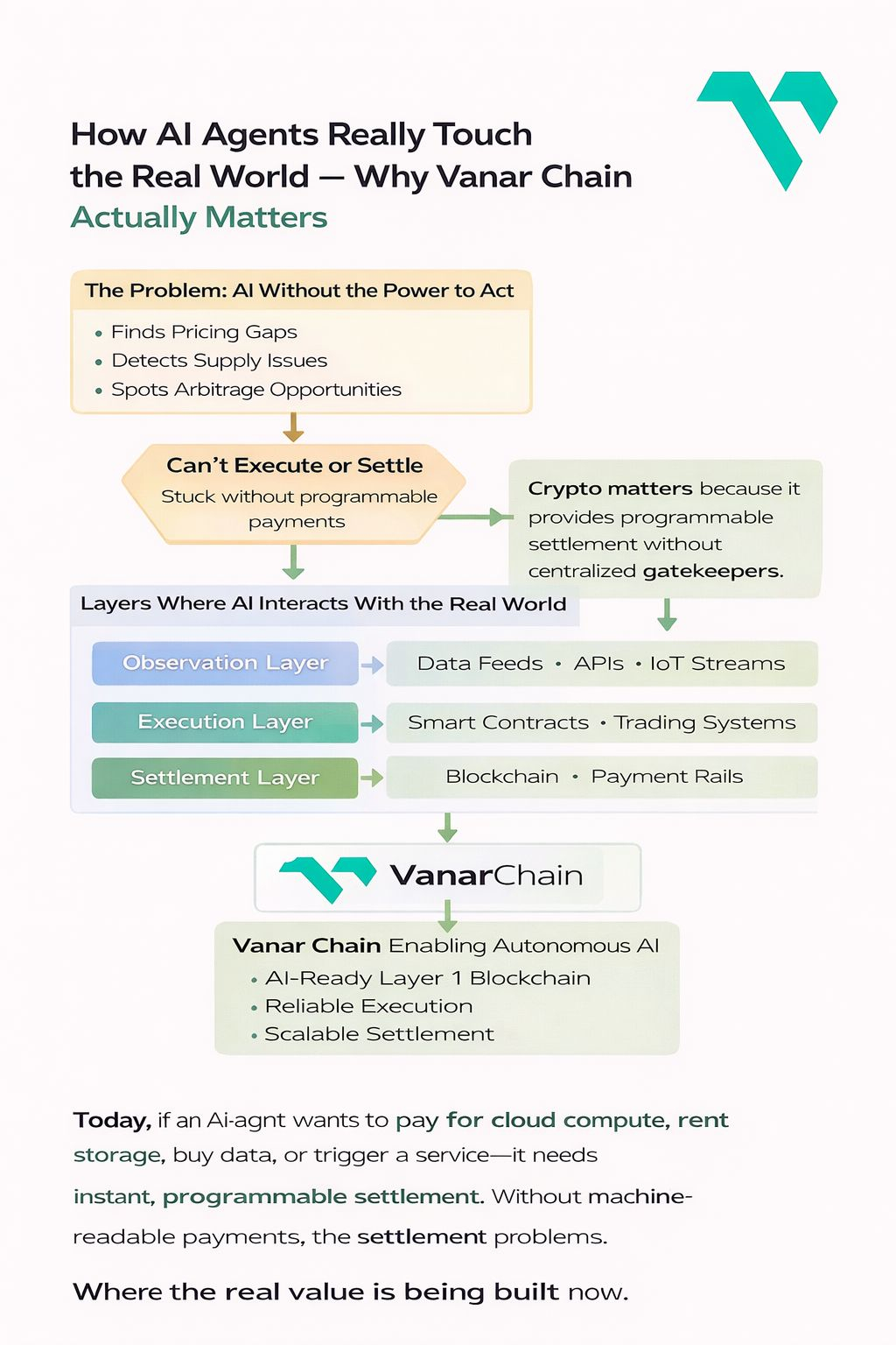 Second, the execution layer: smart contracts, trading platforms, automated payment systems that turn decisions into real action.Third, the settlement layer: blockchains or financial rails that actually finalize the exchange of value.Crypto matters now because it lets yousettle,programmatically,with no middleman. That’s where Vanar Chain fits in.