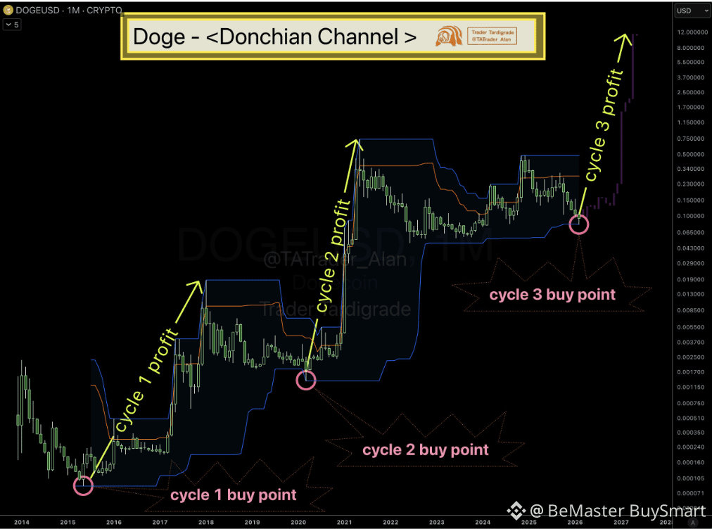 👉 Dogecoin's long-term price behavior shows a fascinating pattern around the Donchian Channel support zone. A crypto analyst spotted three distinct market cycles where DOGE touched the lower channel boundary before launching into powerful rallies. You can see the primary analysis on X.