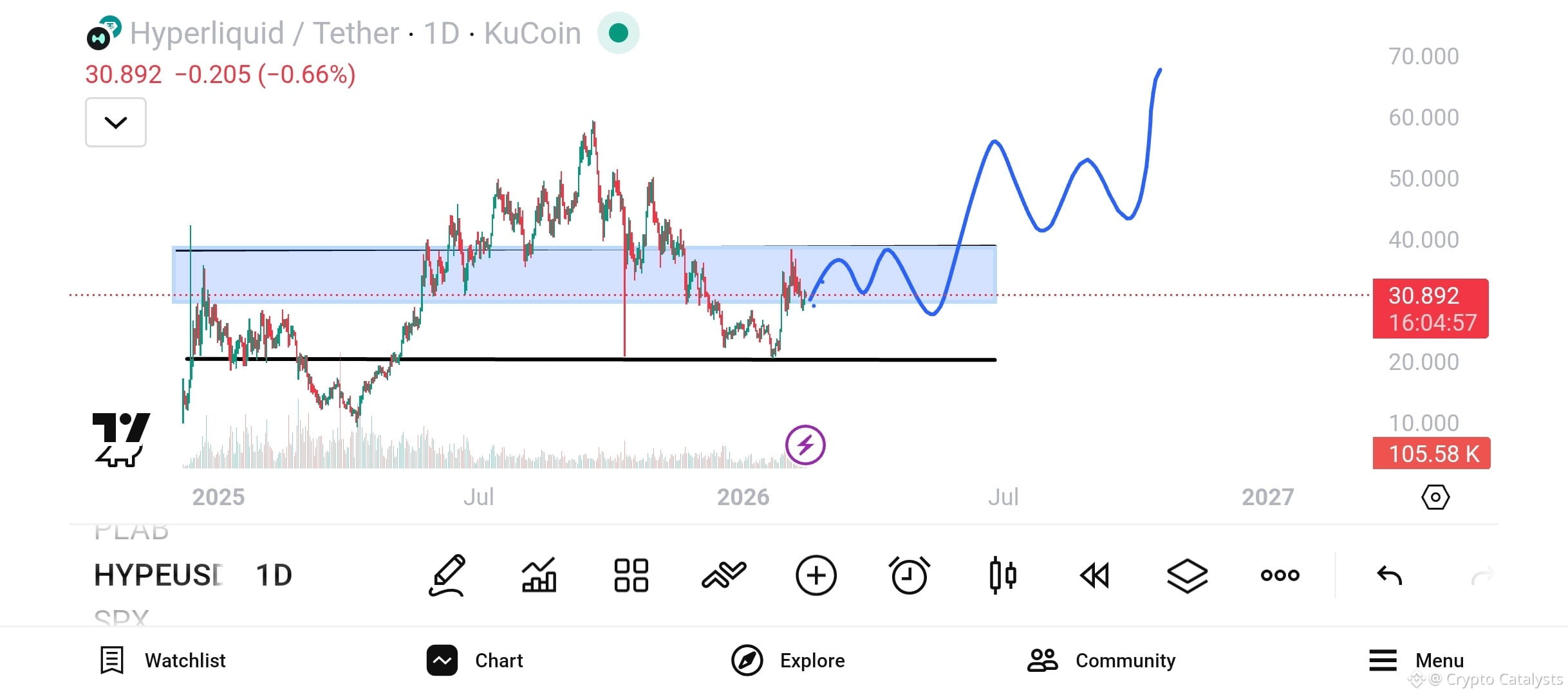 Hype is currently in a high-conviction recovery phase following a significant period of accumulation at the 20.00 level. As of the current candle, HYPE is trading at 30.892, testing the threshold of a major supply zone. The market structure has shifted from neutral to decidedly bullish on the mid-term horizon.
