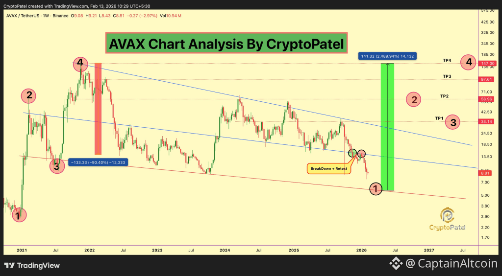 A recent technical outlook shared by Crypto Patel places Avalanche at a critical high timeframe moment. The analysis outlines how AVAX completed a deep cycle correction near the $5.67 region after falling more than 95% from its previous peak.
