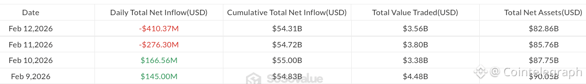 Spot Bitcoin (BTC) ETFs recorded $410.4 million in outflows, extending weekly losses to $375.1 million, according to SoSoValue data.