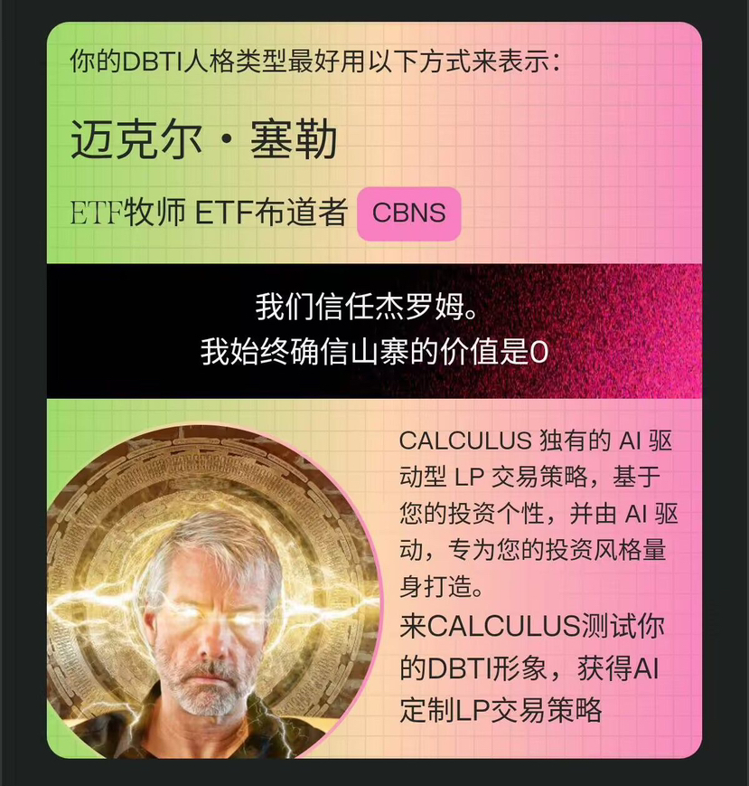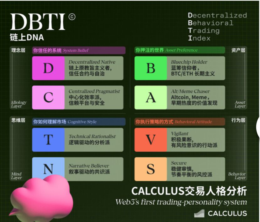 传统解决方案总在教导我们“战胜人性”,而这本身就是一个反人性的伪命题。真正的破局之道,不在于对抗,而在于深刻的认知与精准的适配。这正是 Calculus Finance在 BNB 链上构建 AI 驱动民主化投资生态的核心哲学。它推出的链上交易人格测评系统 DBTI,并非又一个简单的心理测验,而是一次将行为金融学、逆强化学习与区块链透明性相结合的范式升级。