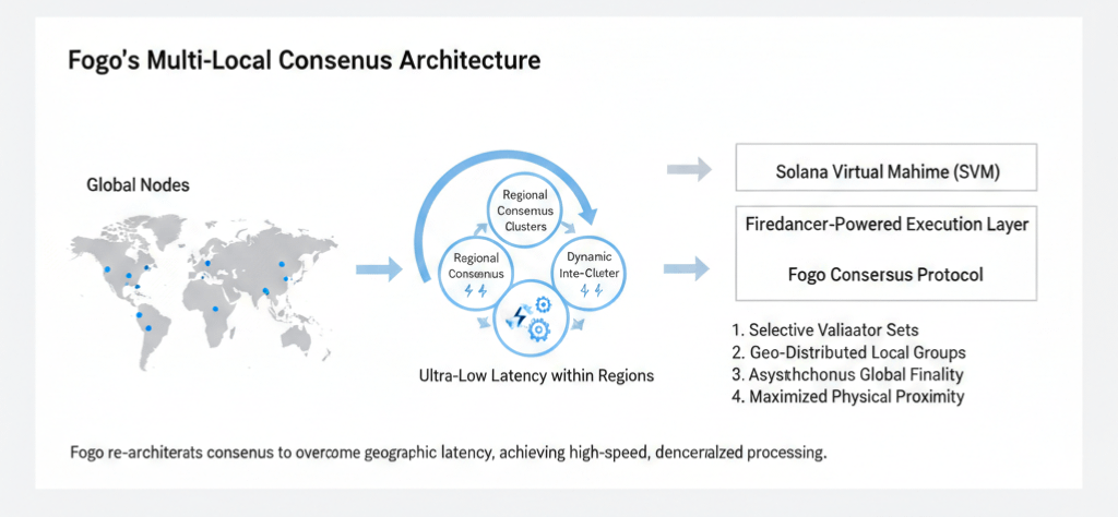直到我最近深度拆解了 Fogo 的方案,才觉得这帮人总算摸到了点儿门道。Fogo 给人的感觉不是在旧围墙里打补丁,而是直接把 Solana 的发动机拆了,换上了纯粹由 Firedancer 驱动的全血内核。这种对 SVM 执行层的极致压榨,让它在保持完全兼容的同时,把性能拉到了一个前所未有的高度。但我最看中的不是这种暴力美学,而是它那种“带点狠劲”的共识逻辑。Fogo 搞了一套多地局部共识和动态协同部署,它不再天真地要求全球节点在每一个微秒都同步,而是通过精选的高性能验证者集,在局部物理空间内实现超低延迟的共识。这种感觉就像是把原本散落在全球的嘈杂议会,精简成了几个高效运作的区域核心,既保留了分布式的容错能力,又在物理层面突破了地理位置造成的延迟诅咒。