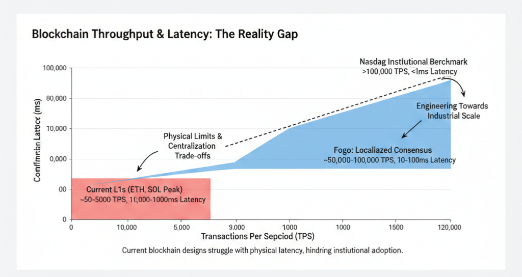 最近在和几个深耕 Solana 生态的朋友撸串时,聊起了一个让我挺感慨的话题,大家都在吐槽现在的 Layer 1 赛道简直是陷入了某种“平庸的死循环”。不管是老牌的以太坊还是风头正劲的各类二层网络,一旦遇上真正的市场波动,那种捉襟见肘的吞吐量和让人高血压的延迟,简直就是对“去中心化金融”这五个字的讽刺。看着以太坊主网那几十 TPS 的可怜带宽,或者是那些号称高性能却在 5000 TPS 面前就集体“宕机”或疯狂拥堵的扩容方案,我总觉得我们离纳斯达克那种每秒十万级操作的工业强度还差着一个大航海时代。这种骨子里的虚弱,在面对全球金融系统的高频博弈时,就像是拿着冷兵器去冲锋坦克阵,不仅效率低下,更是让所谓的高级流动性成了水中月、镜中花。
