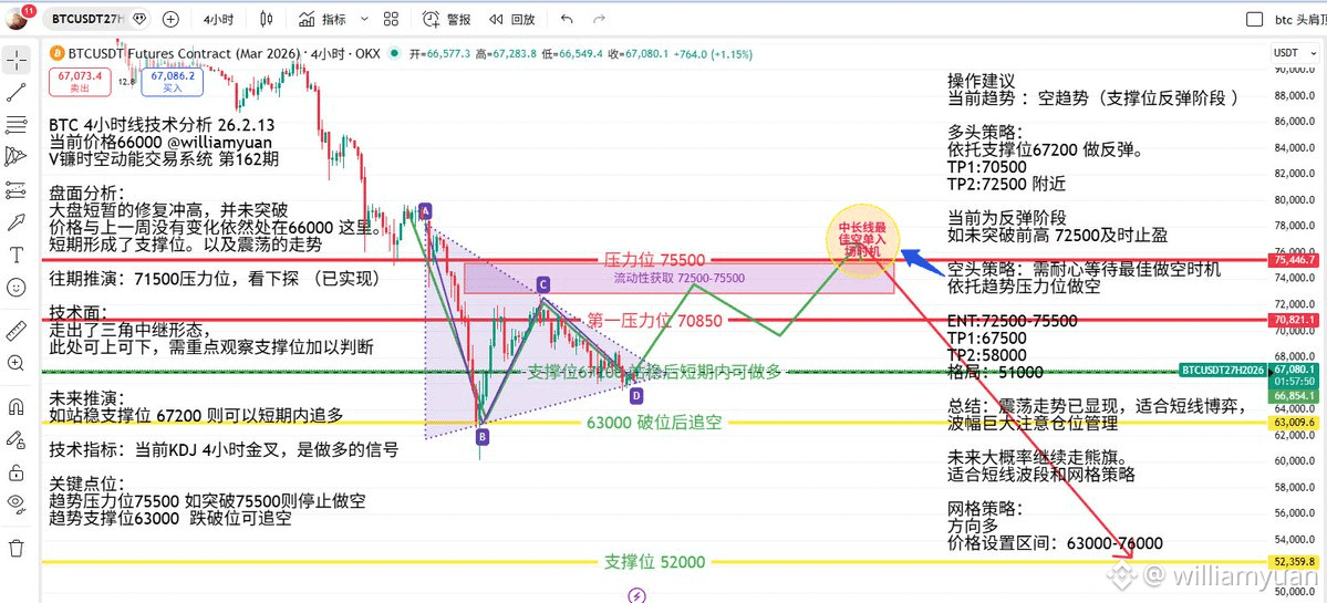 可以吃67K的战术反弹,但别忘了手里攥紧高空的大镰刀。 图表逻辑在下面,拿走不谢。跟上大盘节奏,知行合一。