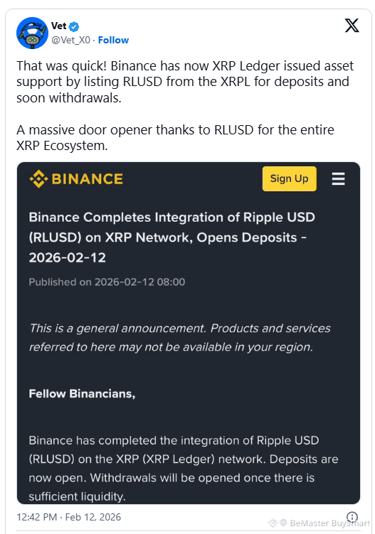 Details highlighted by Vet draw attention to a February 12, 2026, confirmation from Binance that RLUSD issued on the XRP Ledger is now integrated for deposits, with withdrawals expected once sufficient liquidity develops.