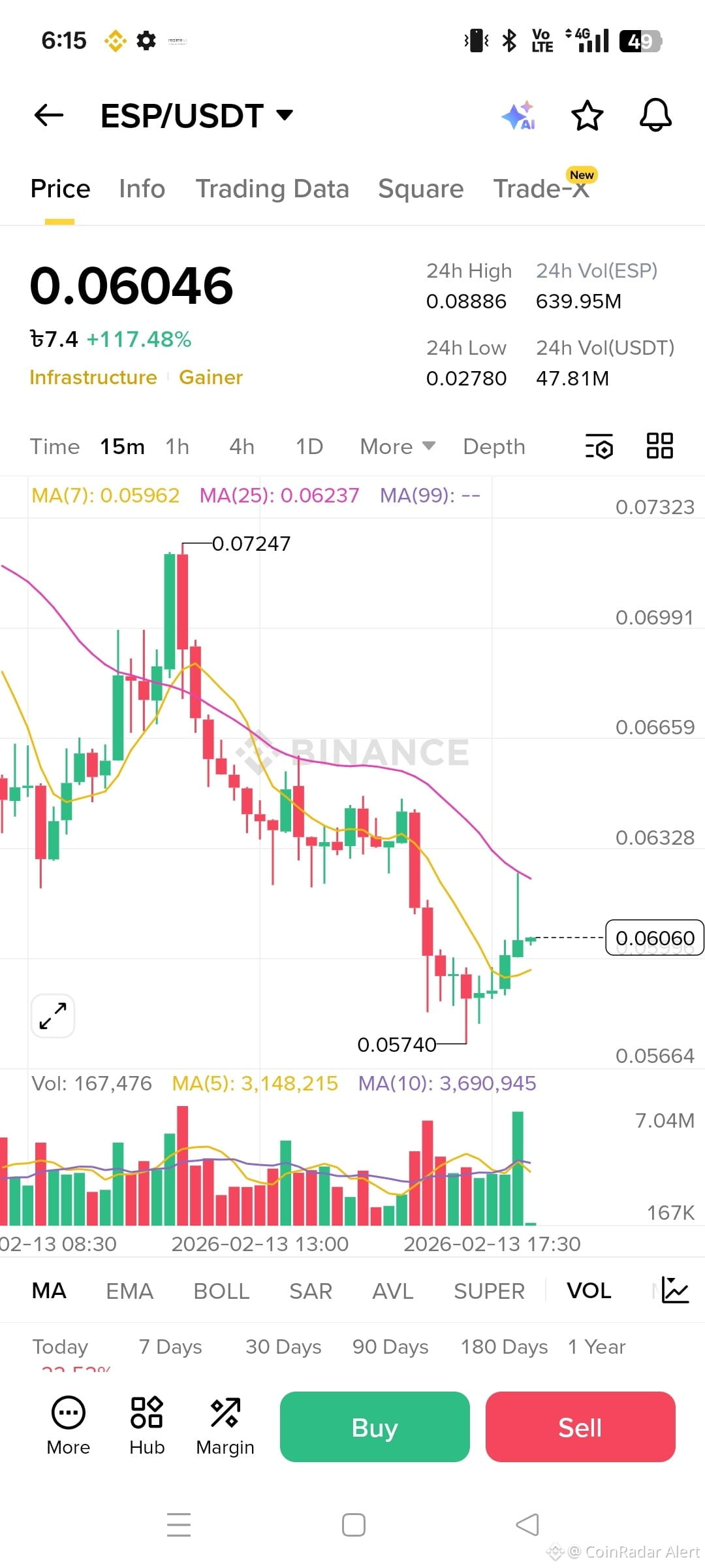 Technically, the levels matter more than the indicators right now. The 0.057-ish region looks like a key support area where price has already shown some defense, and if that holds, it can become a higher-low structure that sets up the next push. Overhead, the first “problem zone” is around 0.062 to 0.073, basically the area where price previously traded before accelerating and where sellers often reappear. If ESP can reclaim and hold above that mid-0.06 range on decent volume, it’s usually the first sign the correction phase is ending and the market is ready to retest higher levels.