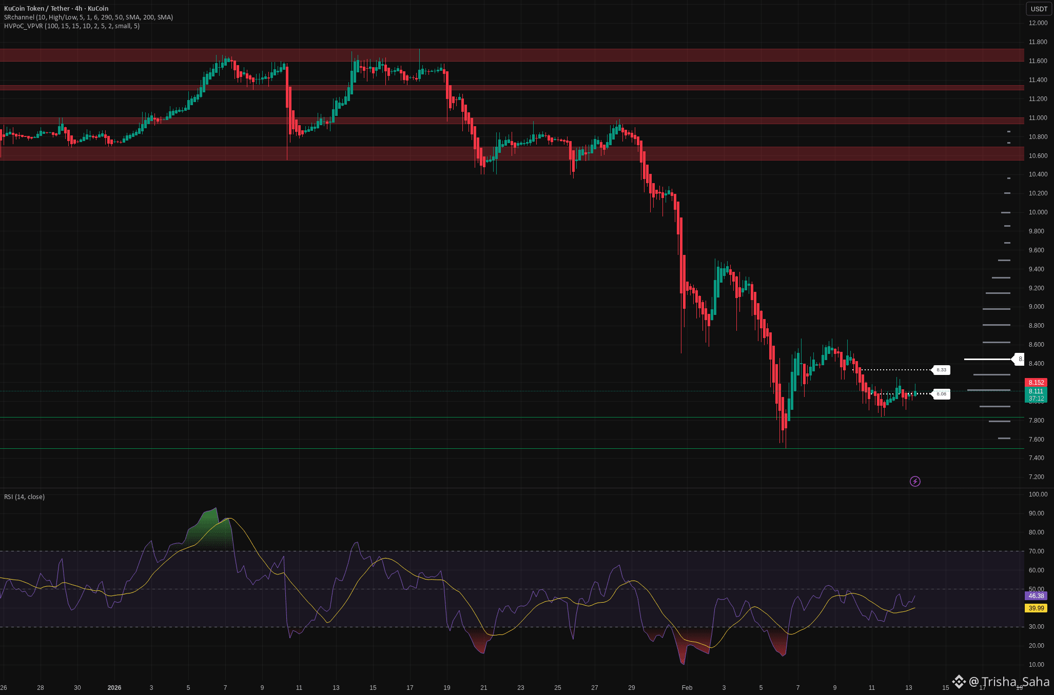On the 4H chart we’ve got a classic post‑crash base: support holding around 7.9‑8.0 with shrinking sell volume and RSI climbing from oversold but still below 50. I’m leaning long: short sellers look tired, and any good news on the exchange side can spark a fast short squeeze. First serious liquidity sits near 8.3‑8.5, then higher up toward 8.8‑9.0 if momentum kicks in. I might be wrong, but I don’t see aggressive new supply here yet.