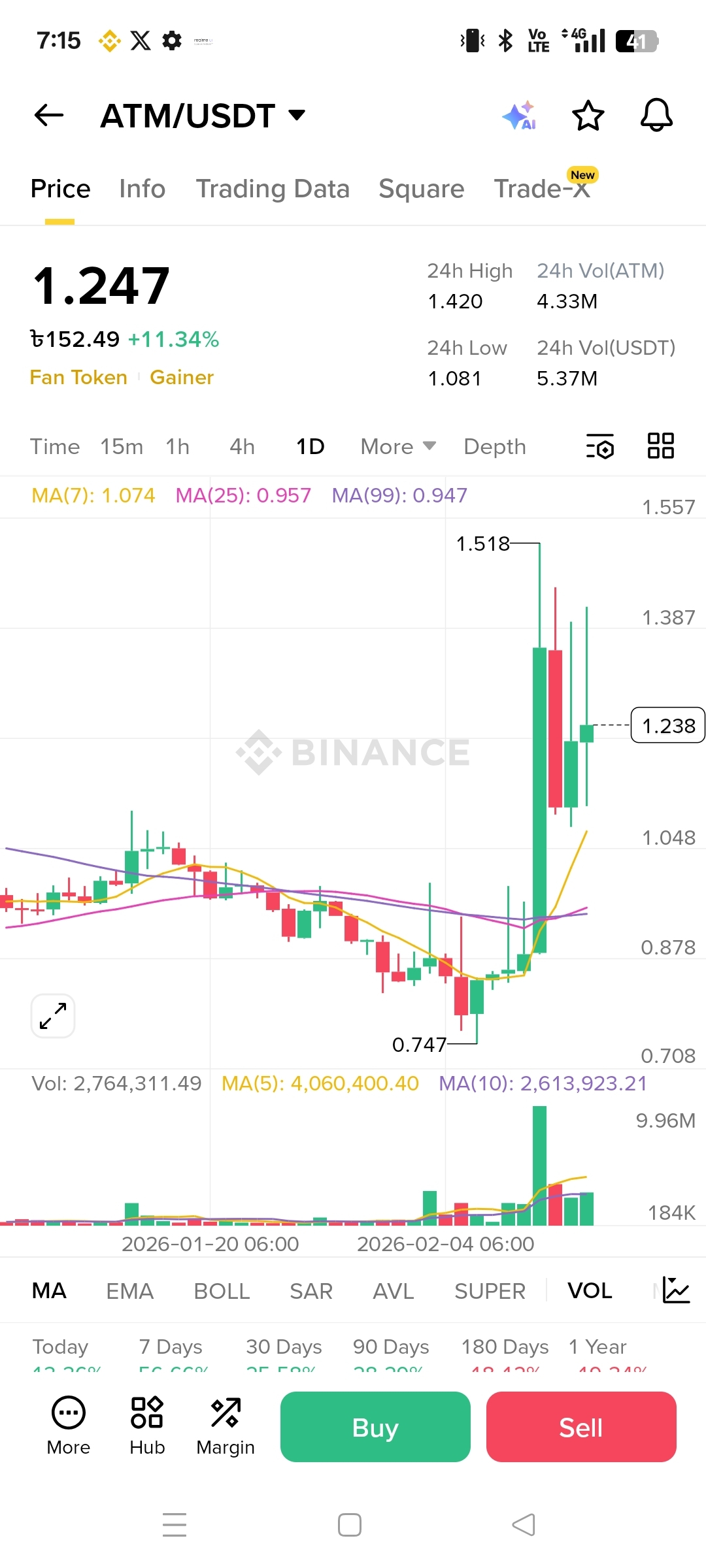 If you’re looking at $ATM right around that time, the big story is simple: it’s in a momentum phase, and momentum phases in fan tokens can pay fast but punish even faster. The move you described has the classic “impulse candle + volume expansion + bullish MA reclaim” look, which is usually what traders want to see when a coin transitions from basing to trending. The only catch is that these tokens don’t trend politely. They tend to rip, stall, wick both directions, and then decide later whether it’s a real trend or a hype spike.