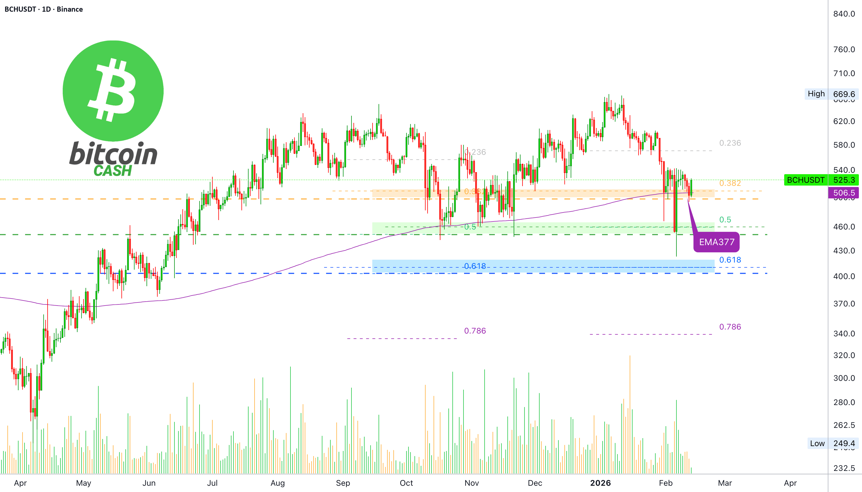 It is the third time BCH moves below EMA377, yesterday, just to recover—once more. This is another confirmation of support and the final one. This development opens up a higher high next, a price tag above the $669 high, a multiple years high, and a main target of $822 short-term (within 30 days).