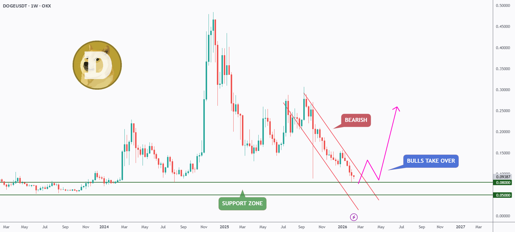 DOGE is currently approaching a major weekly support zone $0.08 – $0.05 .