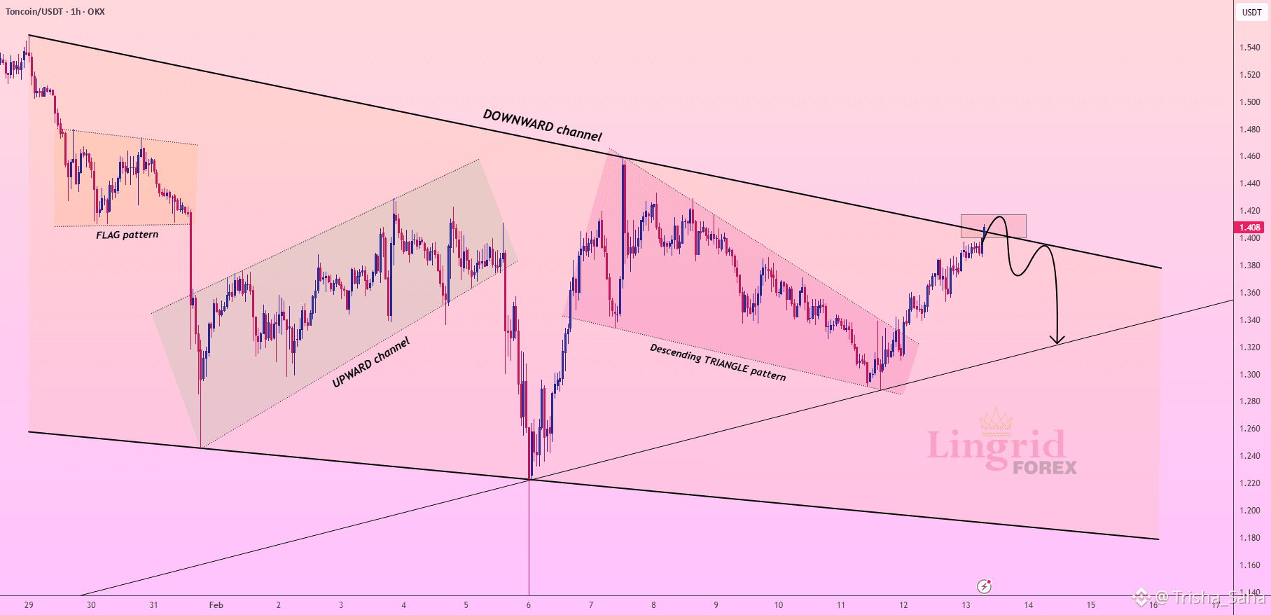TONUSDT perfectly played out my previous trading idea. Price is testing upper boundary of a well-defined descending channel, where multiple prior reactions have emerged. The recent advance appears corrective rather, climbing into a confluence of dynamic resistance and horizontal supply near 1.40â1.42. Structure still reflects a sequence of lower highs on the broader slope, suggesting that upside attempts may be vulnerable if sellers defend this region.