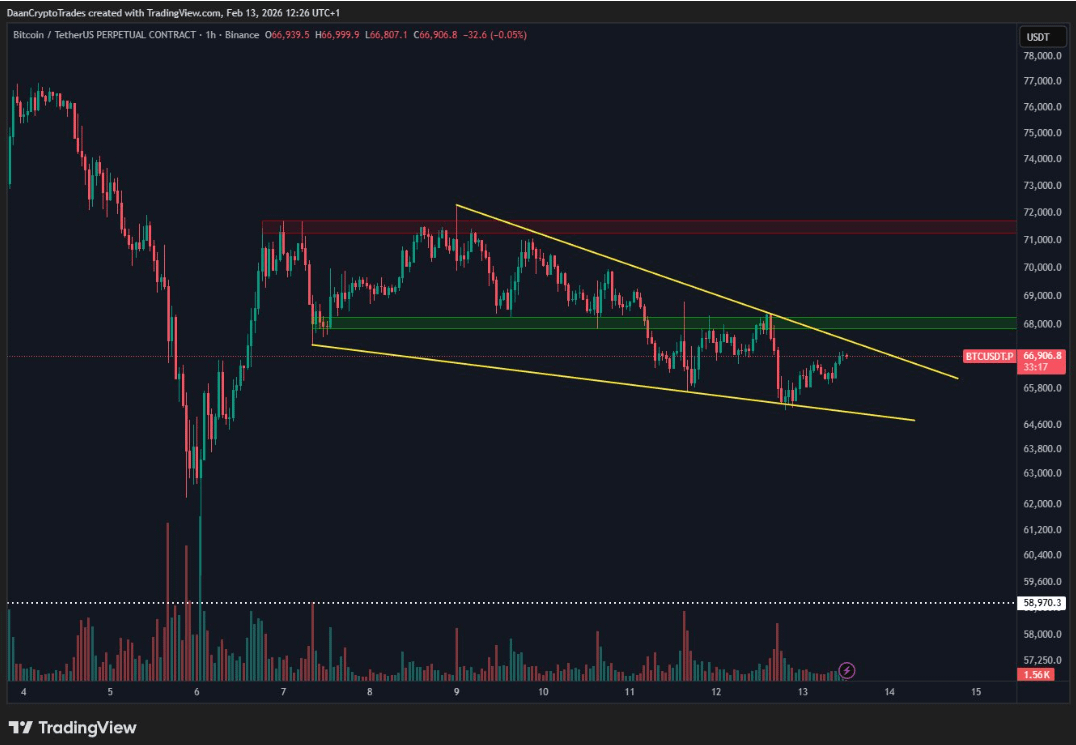 👉 Looking at the chart, you can see a series of lower highs forming along that descending resistance line, while buyers keep stepping in to defend support within the pattern. Right now, price is bouncing around the middle of the wedge—classic indecision territory. That $68K level is the main obstacle standing in the way, and Bitcoin needs to reclaim it before any real momentum can build toward a breakout.