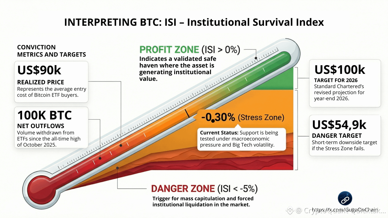 The Institutional Survival Index (ISI) monitors this pain threshold. If the ETF margin remains negative, the Danger Zone will be inevitable. We are living in a regime where Bitcoin seeks a new floor before the recovery promised for 2026 and, from what we see, driven by signals from the technology sector.