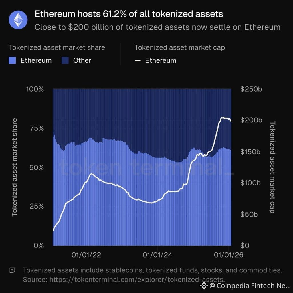 Ethereum now hosts more than 60% of all tokenized assets, with nearly $200 billion already settled on the network. That’s not just a DeFi statistic—it reflects real capital moving on-chain.