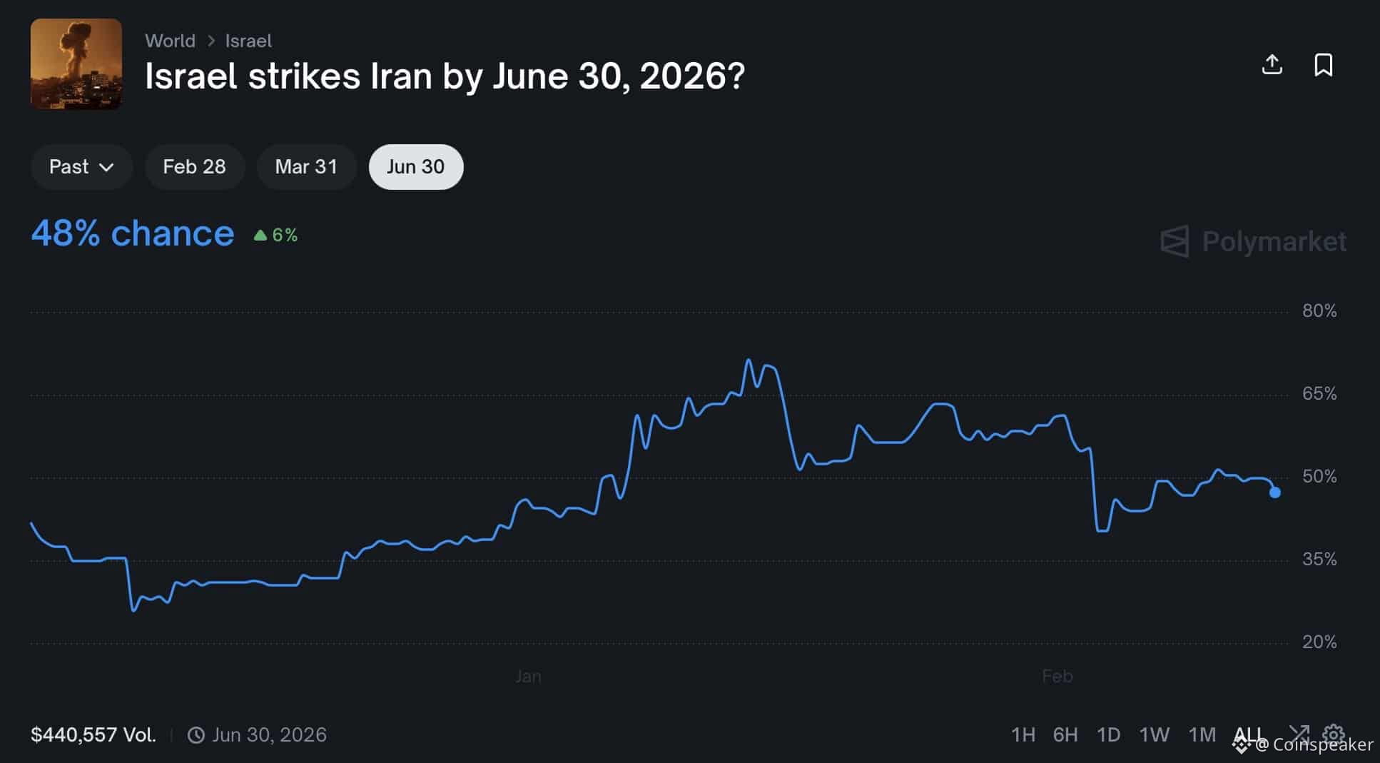 Israel strikes Iran by June 30, 2026? Source:Â PolyMarket