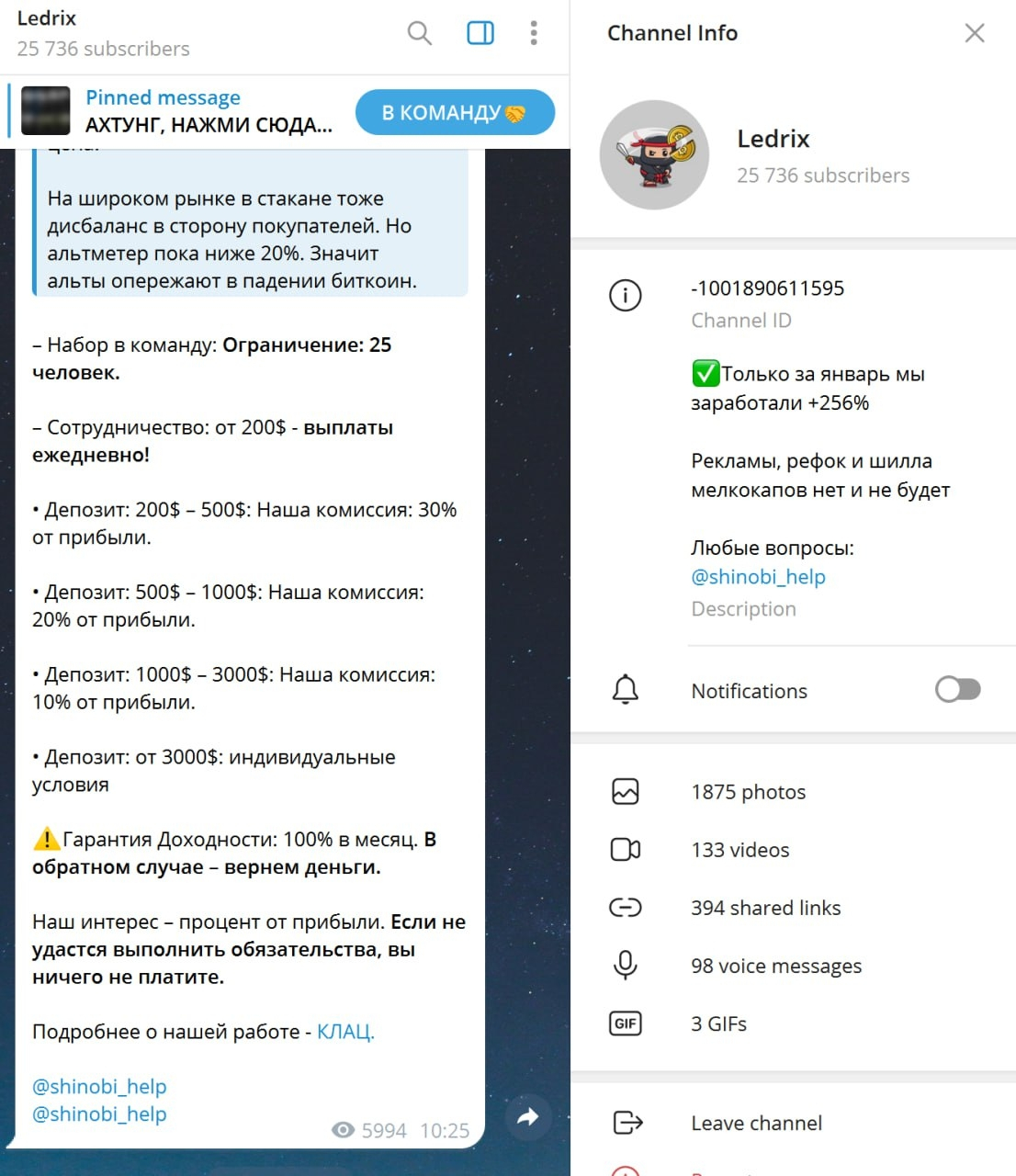 Финал всегда одинаковый: после оплаты или отказа: бан в чатах/канале. Деньги не возвращаются.