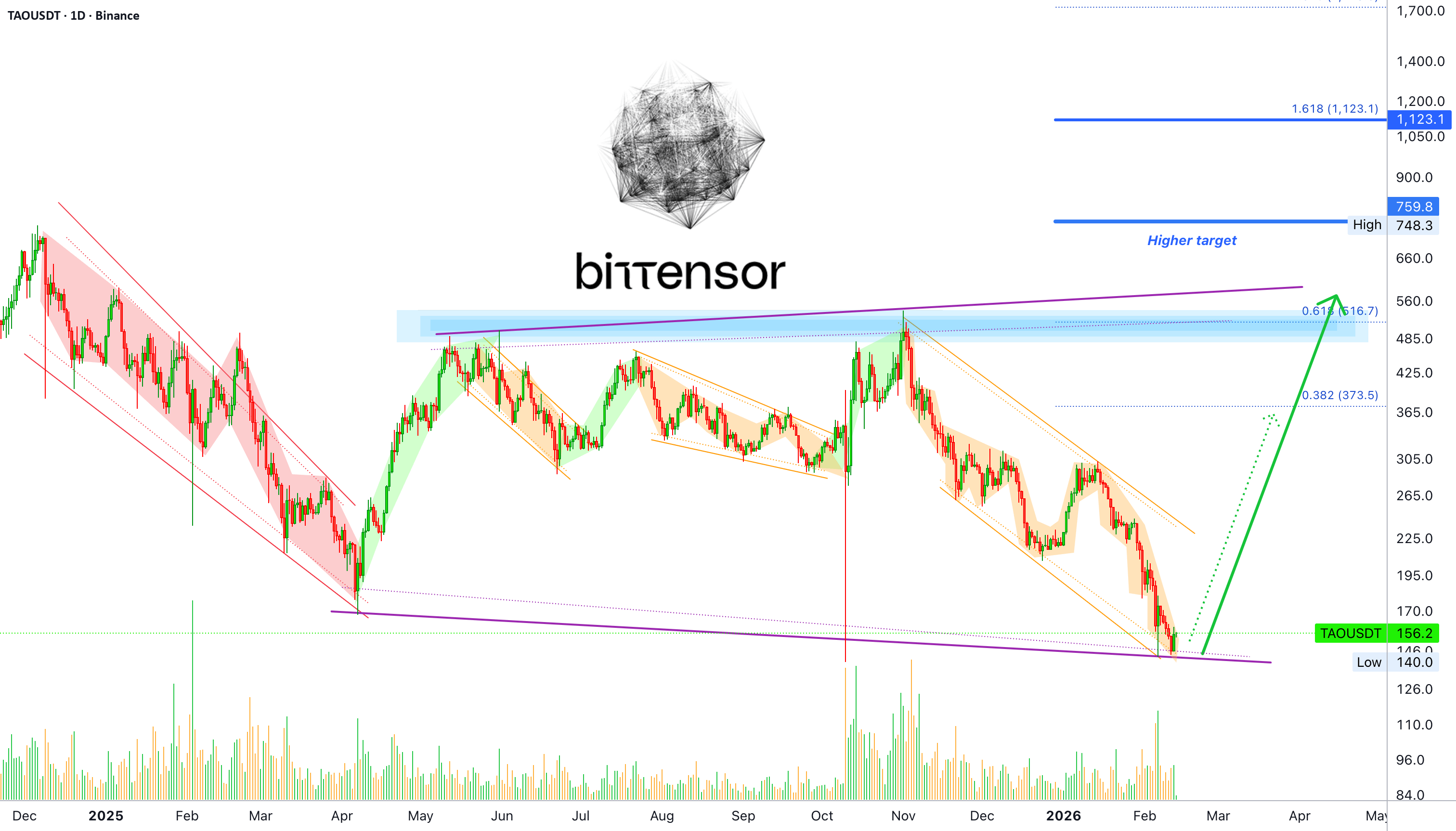 من الناحية التقنية، لدينا قاع مزدوج على المدى الطويل بين فبراير 2026 وأكتوبر 2025. يتم التداول الآن في TAOUSDT عند أدنى مستوى له في تاريخه.