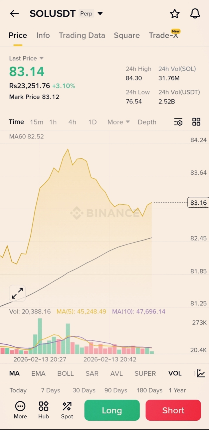 SOL is trading above the MA60, showing short-term bullish stability after a strong recovery from the lows. Price is holding structure with healthy volume, suggesting buyers are still in control. Continuation is possible if SOL maintains strength above current levels â otherwise, expect a controlled pullback into support.