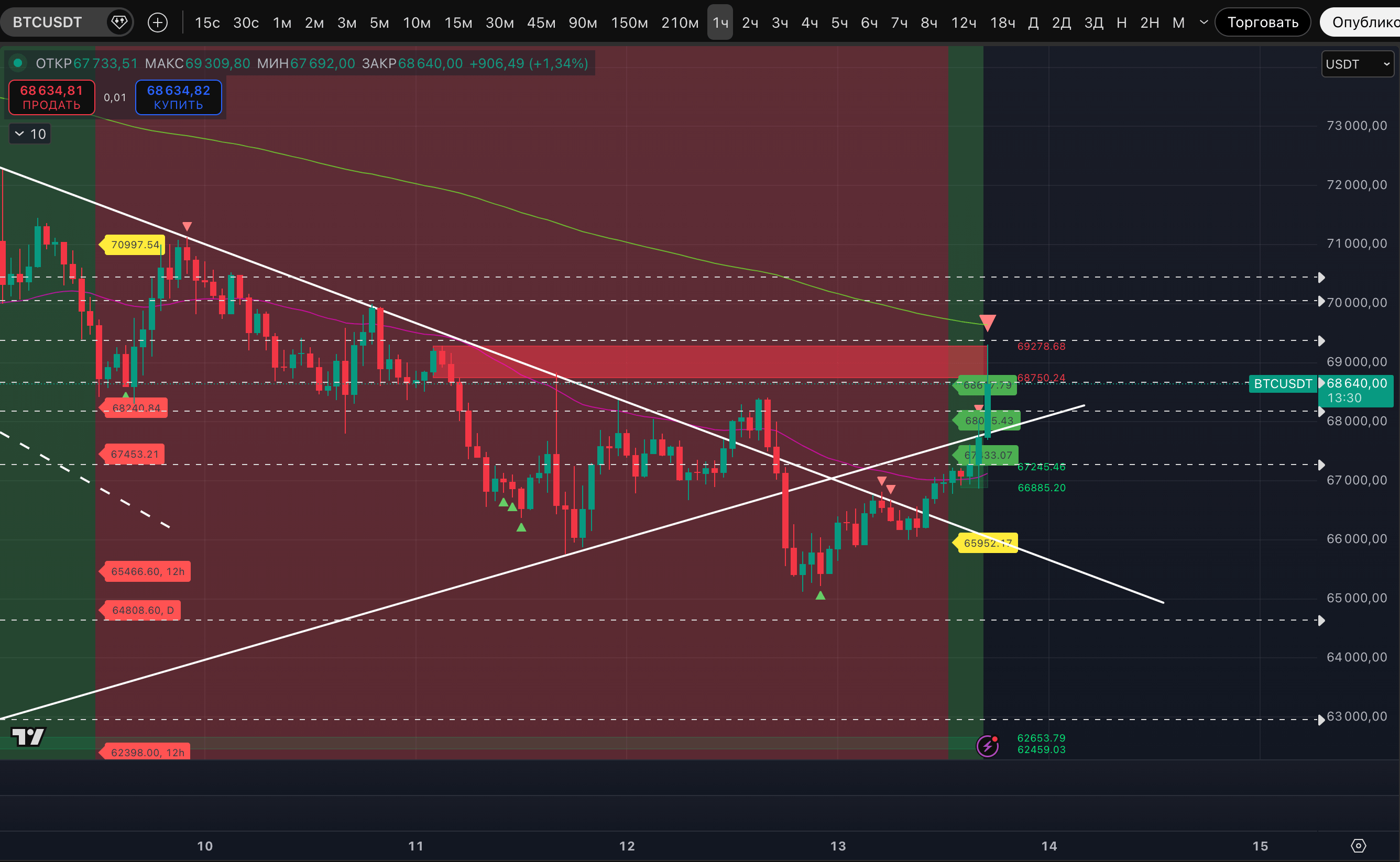 Ответ на этот вопрос для себя дадим чуть более чем через 2 часа, когда будет закрываться 3-часовая свеча. Текущим ростом собраны уже обе зоны ликвидности по #BTC, о которых писали в утреннем обзоре - 67 643-68 434$ и 68 750-69 278$. Текущий хай - 69 309$. Зона ликвидности 68 750-69 278$ при этом не пропала с графика, потому что наш индикатор P73 Smart Liquidity Zones убирает зоны только при закреплении выше них. А закрепления - не было.