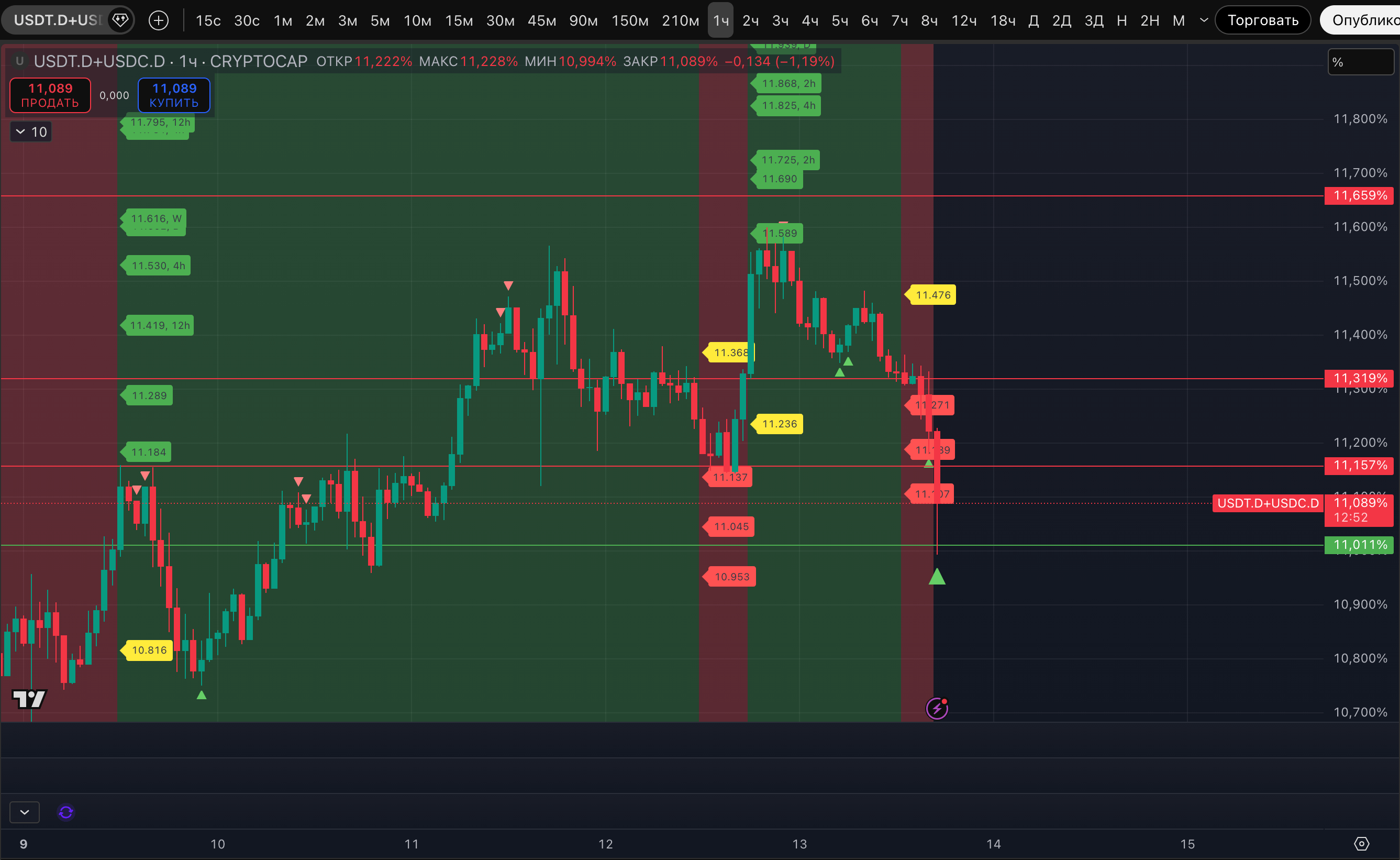 - Strong signal потенциального лоя на часовом ТФ у доминации стейблкоинов #USDT + #USDC. Реакция отскока пошла от горизонтального уровня 11,011%.