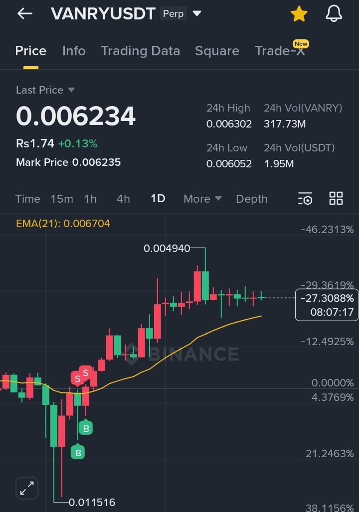 The price remains below EMA21 at 0.00670, which keeps the higher timeframe structure slightly bearish.