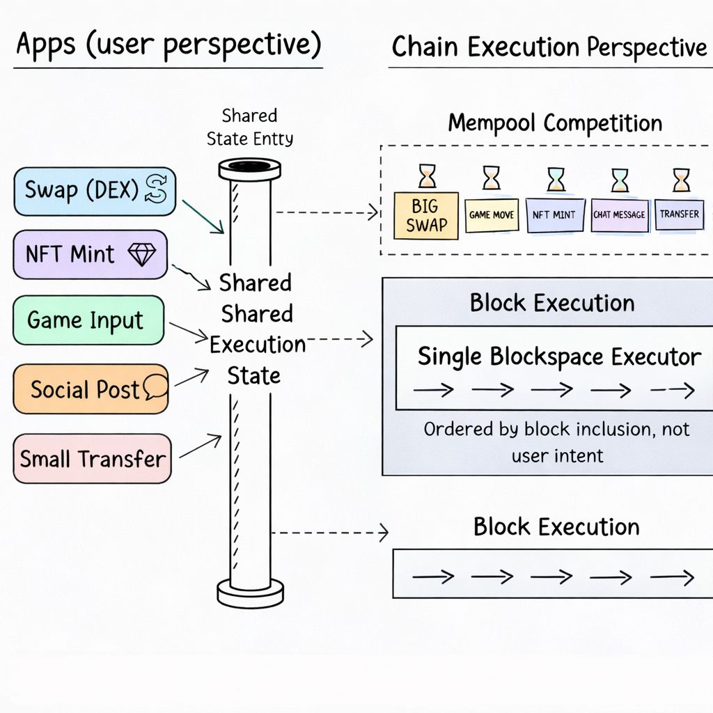 Have you ever felt a simple action slow down right after heavy activity on a chain? A swap, an NFT mint, even a small game input all pass through the same execution space and update the same shared state one after another, meaning completely different actions still wait in the same line. The structure looks efficient because keeping everything connected helps financial activity coordinate smoothly, but once many different interactions happen together, unrelated actions begin affecting each other’s timing, and the experience stops feeling as smooth as the design suggests.