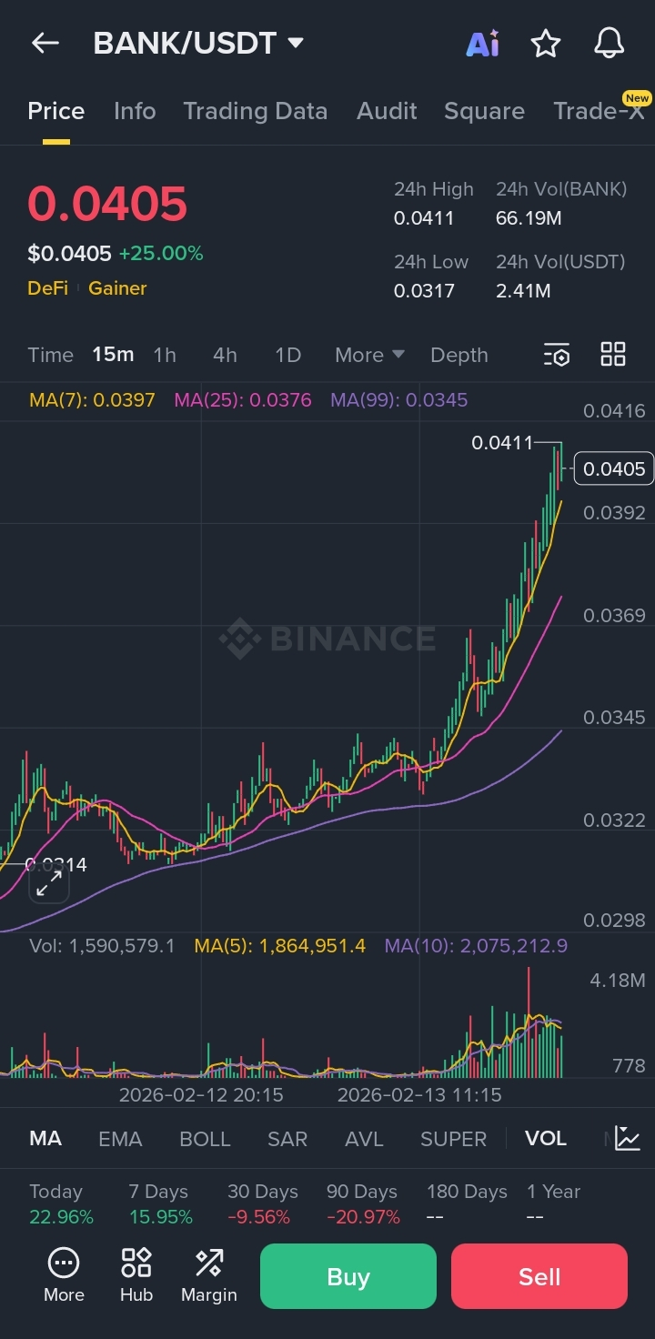 $BANK is showing a sharp bullish expansion on the 15m timeframe. Price is trading around 0.0405, up nearly 25% intraday, after breaking above previous consolidation near 0.036–0.037. The structure shifted from sideways accumulation to strong impulsive movement with consecutive higher highs and higher lows.