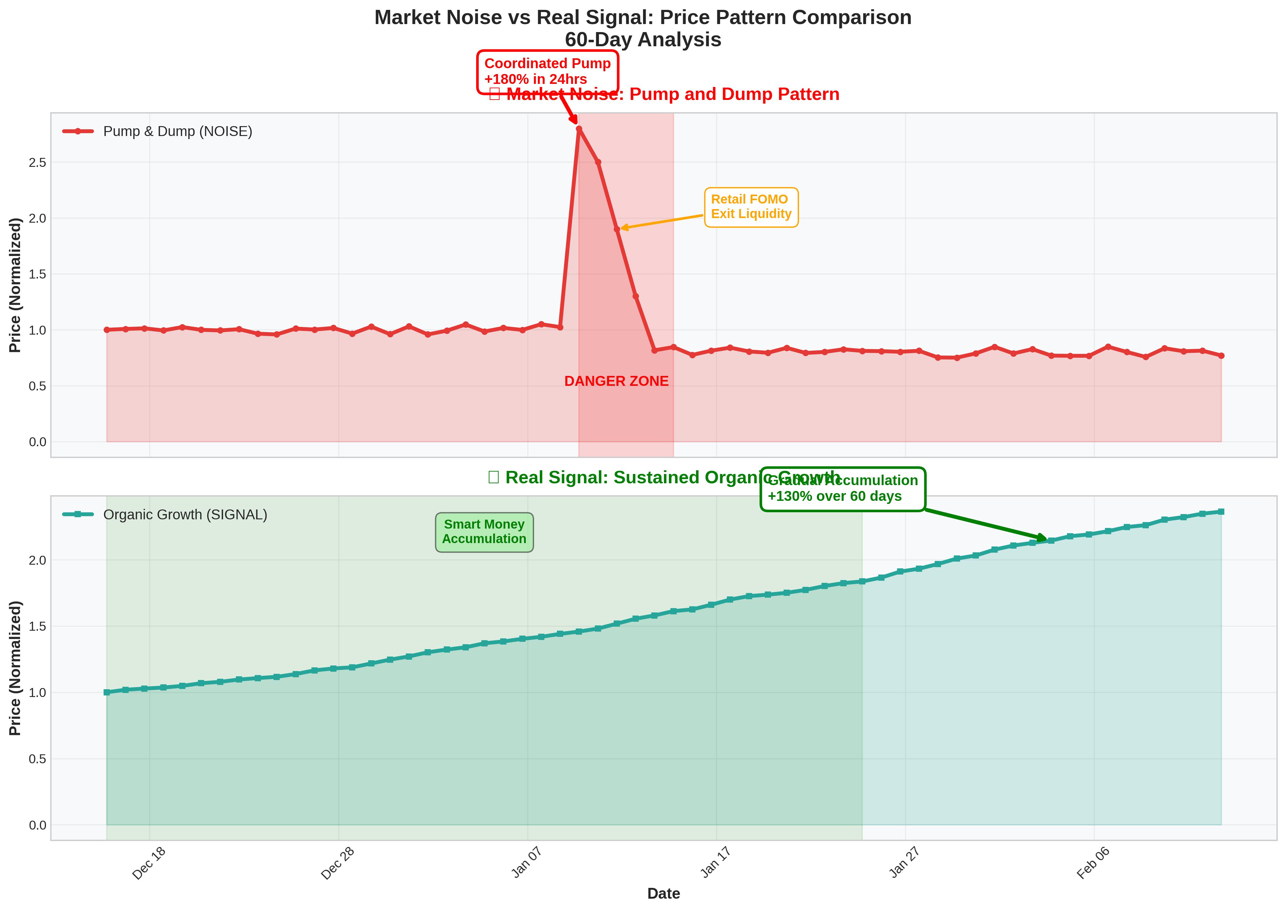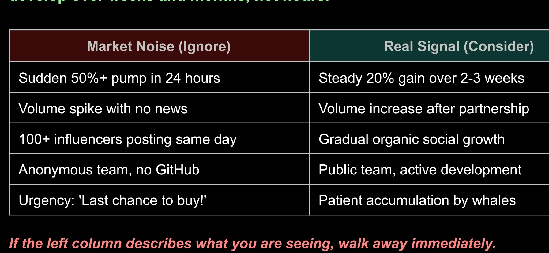 Real signals are sustained price movements backed by actual adoption, technological progress, institutional interest, or genuine market demand. They develop over weeks and months, not hours.