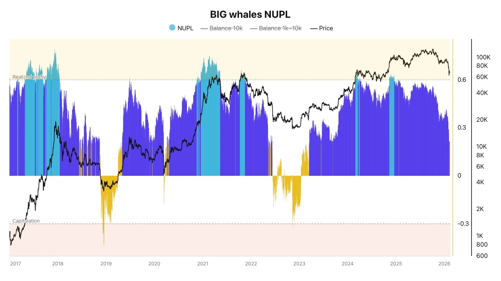 Large $BTC holders, known as whales, are becoming less predictable. On chain data shows their unrealized profits have dropped sharply, with the Net Unrealized Profit/Loss (NUPL) for major wallets falling below 0.2.