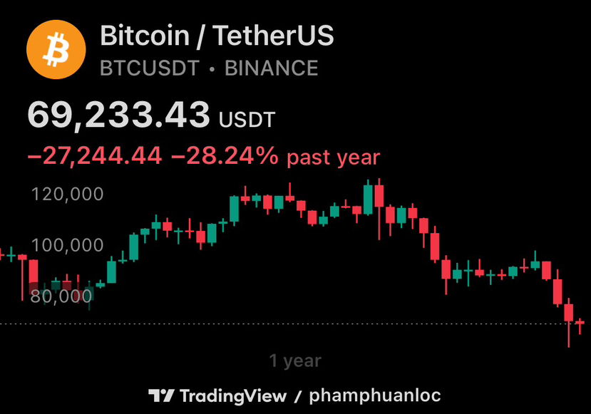 The market does not collapse with a single violent move, it chooses a slower and far more effective method, it erodes conviction over time. Over the past 12 months, Bitcoin has declined from the 96,000 to 100,000 USD area to around 69,000 USD, a drawdown of roughly 28 percent. This is not a shock event, it is a prolonged process where each weak rebound becomes another test of patience for those who remain invested.