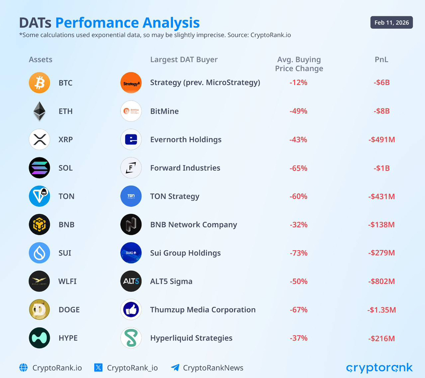 The next layer of the test belongs to large capital. Data on deep accumulation entities shows unrealized losses at scale. The largest Bitcoin accumulator is facing roughly 6 billion USD in losses with price sitting about 12 percent below its average cost. Ethereum shows an even deeper gap, with prices nearly 49 percent below institutional cost basis, translating to roughly 8 billion USD in unrealized losses. Other major assets such as SOL, SUI, and TON record drawdowns in the 60 to 73 percent range. This confirms that the pressure is not isolated to retail, institutions are being tested on conviction and time as well.