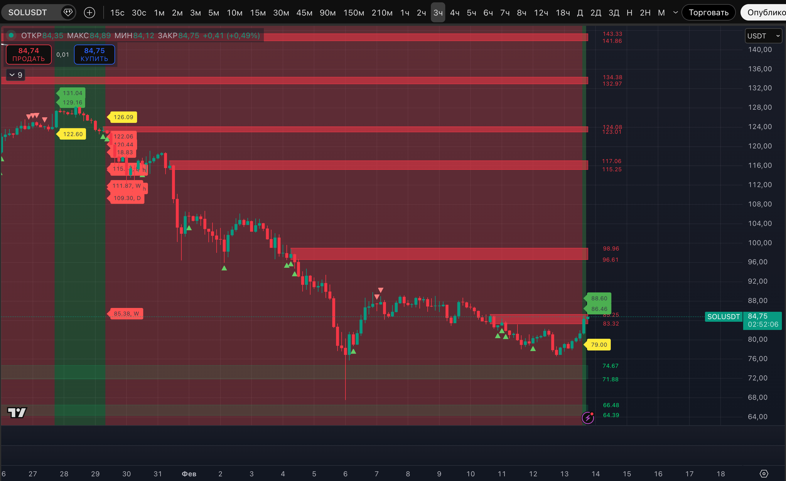 К слову, аптренды на 3-часовом ТФ получили и все топовые альткоины, так что рост пока идет не одним активом. ETH, SOL - тоже в деле. Показываем скрины и по ним.
