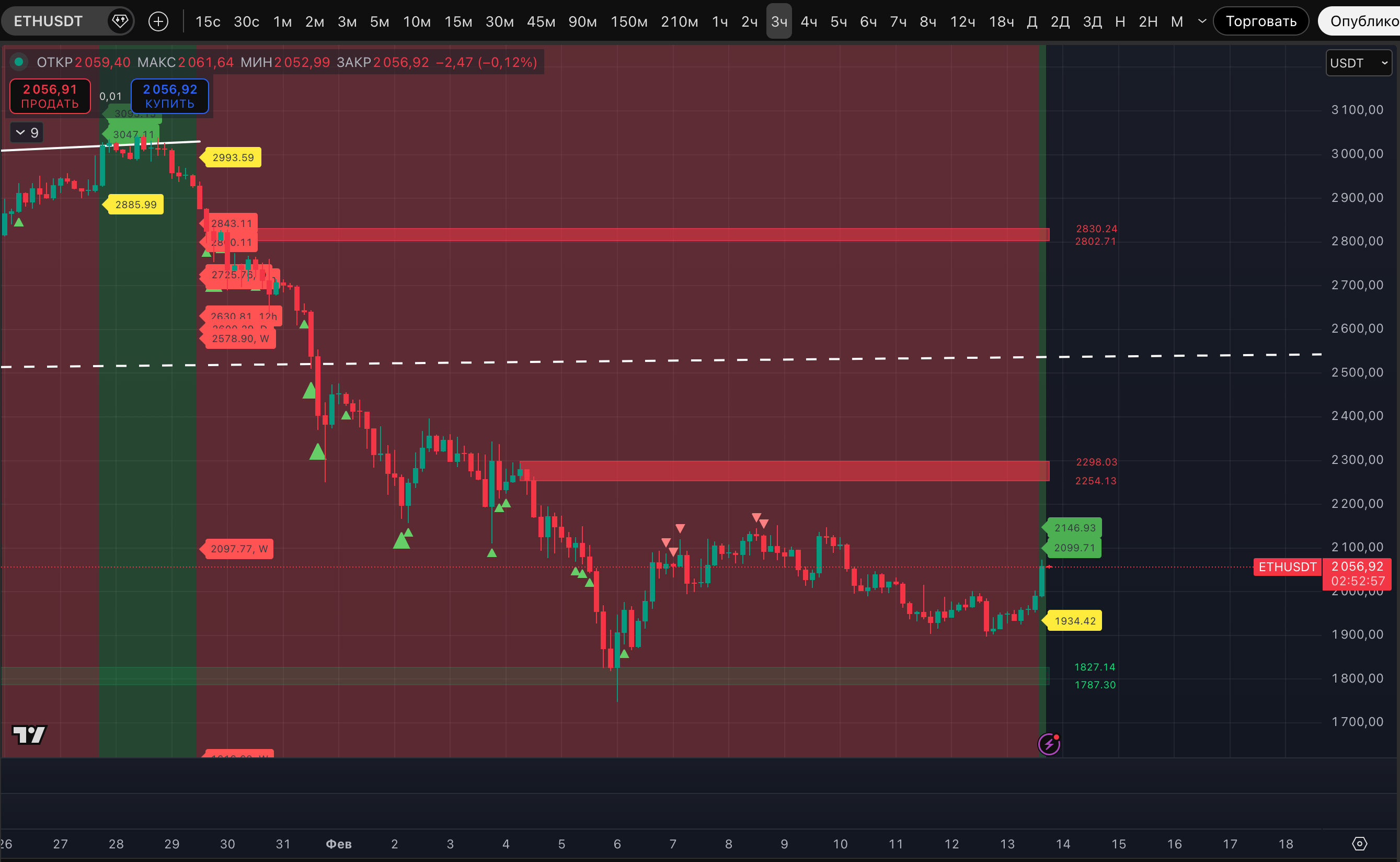 С расчетом, что на коррекции этих меток - будет добор. Или добор будет при подтверждении продолжения роста. В любом случае, в спекулятивных сделках мы теперь - ни минуты не держим позиции против устойчивого тренда 3-часового ТФ. Пропущенный шорт с 90 000$ до 60 000$, который видно на скрине, стал очень убедительным аргументом.