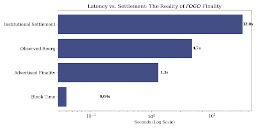 Consensus finality means the network agrees on the block order. Settlement finality means the transaction cannot be reversed without significant economic cost. FOGO provides consensus finality in 1.3 seconds under normal conditions. It provides settlement finality only after approximately thirty-two seconds, which is the time required for enough blocks to accumulate that a reorg becomes economically prohibitive.