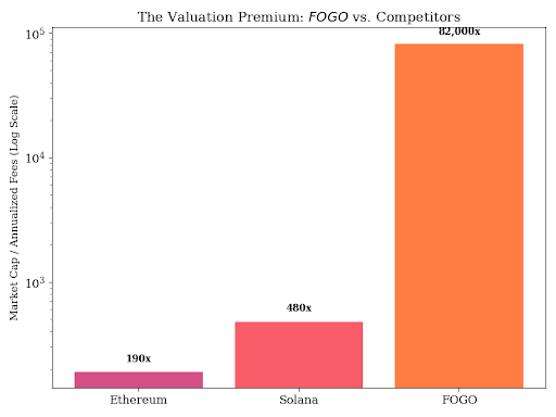 FOGO currently trades at $0.05 with $172 million in circulating market capitalization. This values the network at approximately 82,000 times annualized fee revenue. Solana trades at 480 times annualized fee revenue. Ethereum trades at 190 times.
