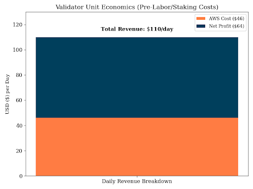 I checked the infrastructure costs for operating a FOGO validator on AWS. The recommended instance type costs $46 per day. This leaves $64 daily profit per validator before accounting for labor, monitoring, and opportunity cost.